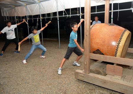 祭りは、地区内9組を三つに分けた当番組を中心に準備している。太鼓の指導も当番組が担い、今年は4、5、6組の大人たちが雨よけ用のテントを張った神社境内で、打ち手の男子小中学生たちに教えている。
