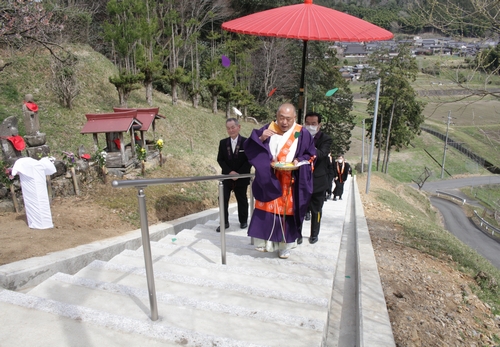 若林兼務住職は「21年は天台宗の開祖、最澄の没後1200年の大遠忌で、その記念事業にもなりました。お寺の顔でもある階段が整ったことで、ますますの興隆を祈念したい。いつまでも元気に地域の人らが、お参りに来てもらえたらうれしい」と話していた。