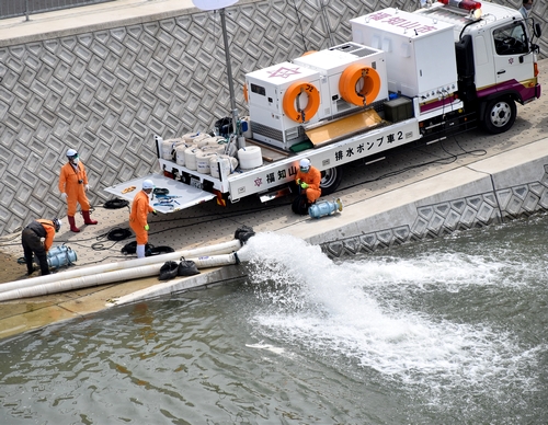 写真=排水ポンプ車の水中モータ駆動ポンプを稼働させた