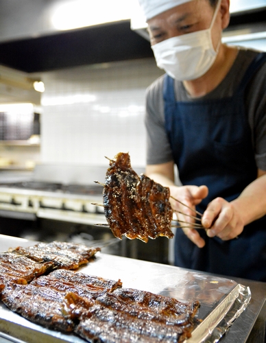 写真=焼き上がったウナギが香ばしく(23日午前10時ごろ、たかた荘で)