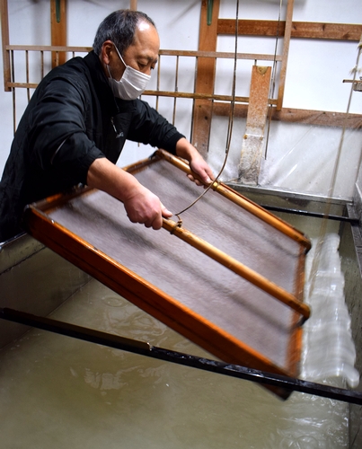 今年は4日に始めた。田中製紙5代目の田中敏弘さん(61)が、地下水を張った漉きぶねの中に、コウゾの繊維とトロロアオイの粘液を入れ、簾桁に液をすくって漉いていく。