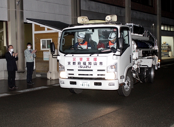 福知山市水内の市上下水道部から18日早朝、職員4人が能登半島地震の被災地支援のため、石川県能登町へ出発した。日本水道協会京都府支部の支援要請に基づいたもので、3・8トンの水を積んだ加圧式給水車1台、移動用車両1台で現地に向かった。