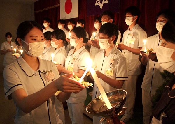校歌斉唱のあと、中村校長がそれぞれに卒業証書を手渡し、「看護という仕事に夢を持って取り組んでほしいと思います。自信を持って進み、自分にしかできない看護で社会に貢献してください」と激励。キャンドルサービスでは、卒業生らがナイチンゲール像から採った炎でろうそくに火をともし、厳かな雰囲気の中で気持ちを新たにした。
