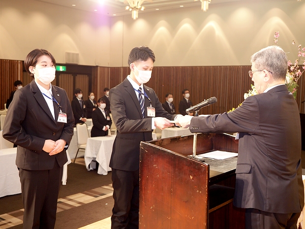 写真(クリックで拡大)=辞令を受け取る新入社員代表