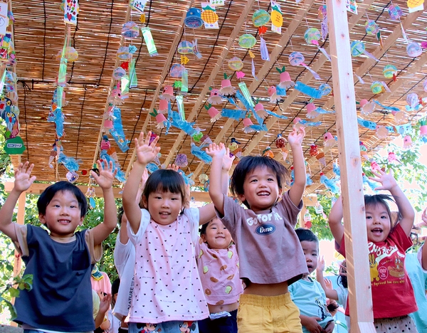 風鈴をつるす土台は園児の親族とその知り合いの大工がこしらえた。一斉に風鈴が取り付けられると、園児たちは大はしゃぎ。「きれい!」「ぼくのがあった!」と飛び跳ねて喜んでいた。