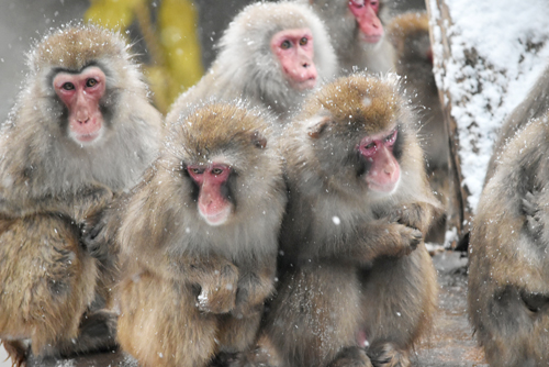 写真(クリックで拡大)=体を密着させて暖め合うサルたち(10日午前8時20分ごろ)
