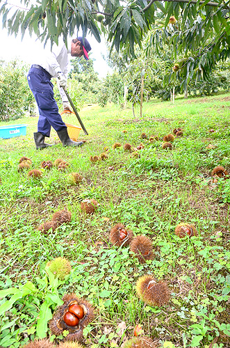 細見さんは、4カ所の計約35アールの栗園で、214本を管理。今年は17日から収穫を始め、今の時期は「銀寄」「筑波」「みくり」など中生の品種の収穫がピークで、地面に転がるイガから金ばさみで栗を取り、かごに入れていく。