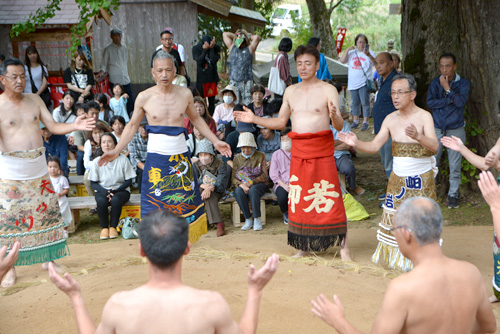 夜久野町宮垣の天満神社で12日、秋の大祭が営まれた。化粧まわしを着けた住民が扮する力士が土俵で歌う「相撲甚句」があり、見物者が拍手を送った。