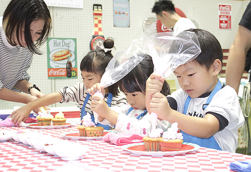 オーダーケーキ専門店「キャプテンティーズ」によるカップケーキ屋さんでは、赤や青など色つきの生クリームでのデコレーションを体験した。スタッフに教えてもらいながら、絞り器でクリームを上手に盛り付けられると得意気な表情を見せ、チョコやグミなどのトッピングを加えて自分だけのカラフルなケーキを作った。