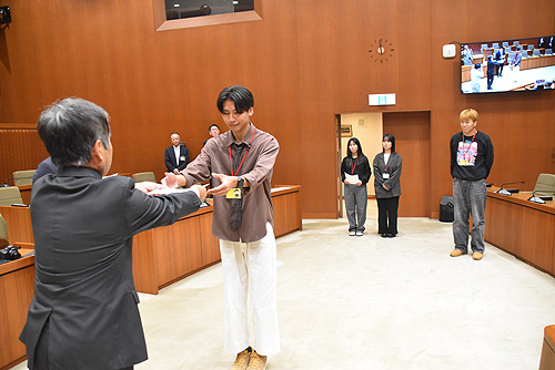 最後に議場で委嘱式があり、吉見議長が一人ひとりに委嘱状を手渡した。学生を代表して、3年生の片桐彩花さんは「貴重な機会をいただきありがとうございます。少しでも力になれるよう頑張りたい」と意気込みを語った。