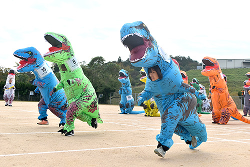 古代の暴君が運動場で走って、飛んで、ずっこけて-。京都府福知山市三和町寺尾の三和荘で25日、ティラノサウルススーツでさまざまな競技に挑戦する「ティラノサウルスレースin三和」が開かれた。大人から子どもまで計59体の恐竜が集結し、「ガオー」と雄たけびを上げながら、徒競走や玉入れなどで競い合った。