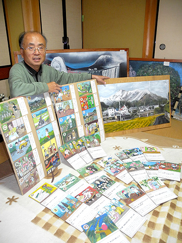 段ボールをキャンバスにして水彩画を描いている京都府福知山市報恩寺、野田恒幸さん(75)が11月4日~8日、綾部市青野町のグンゼ博物苑・集蔵で、「優しいダンボール画展」を開く。入場無料。