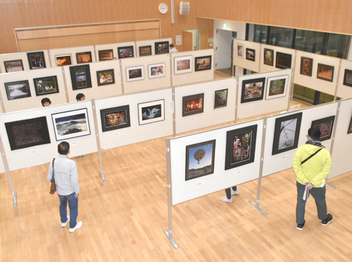 写真上(クリックで拡大)=市民交流スペースには写真作品がずらり(31日午前9時10分ごろ)