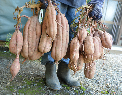 一週間ほど前の収穫時には、数珠つなぎの状態を壊さないよう、最初は手で探りながら掘り進め、全体の形が分かったところでスコップを入れた。数えると大小11個が1株から育っており、一番大きなものは丸々と肥え、長さは27センチのラグビーボールほどの大きさだった。