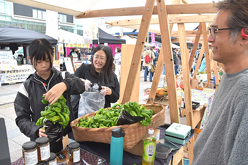 生産者による7ブースでは、黒枝豆が直売されたほか、万願寺トウガラシの詰め放題ブースもあり、袋からあふれんばかりに詰め込む挑戦者の姿に、「すごい」と驚きの声が上がっていた。