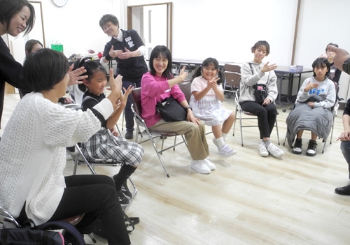 このあと聴覚障害者と、手話の動きが見えやすいように黒っぽい服を着たメンバーが講師となり、「楽しい」といった感情表現や自分の名前、住んでいる場所などを紹介。鬼伝説で知られる「大江」は、鬼の2本の角を表すように両手の人差し指を真っすぐ伸ばして頭の両側に置く動きで、限られた地域で使われる手話表現だということを教えた。