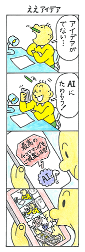 タイトルは、AIとかけた『ええアイデア』で、AIが生成した4コマのアイデアの中に、作者が取り込まれている様子を表現。アイデアを容易に得られる時代の創作の危うさ、虚しさを表現している。
