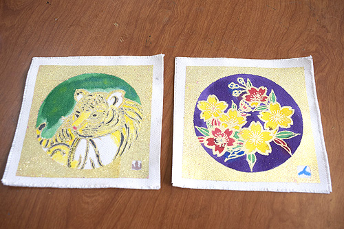 色付けが終わると、志賀さんに布の上から金箔か銀箔を選んで接着加工してもらった。豪華に仕上がった作品を見て児童たちは「きれい」「すごい」と驚いていた。