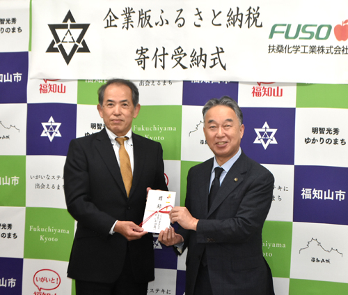 京都府福知山市の長田野工業団地に立地する化学品製造業、扶桑化学工業(本社・大阪市、杉田真一社長)は20日、教育費に対する支援として、企業版ふるさと納税を活用し、2千万円を福知山市に寄付した。小、中学校の児童生徒が使うタブレット端末の更新に伴う付属品の購入費に充てる。