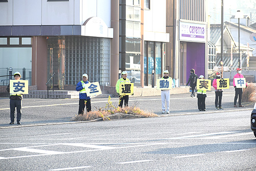 年末の交通事故防止府民運動初日の1日、京都府福知山市交通対策協議会(会長・大橋一夫市長)は駅南町の国道9号沿いで街頭啓発を実施した。パネルや横断幕を掲げ、通勤するドライバーらに交通事故防止を訴えた。