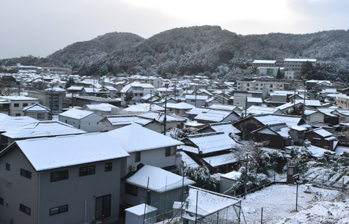 冬型の気圧配置となり、日本上空に強い寒気が流れ込んでいる。京都府福知山市内では3日夕方ごろから降雪があり、4日朝には市街地でも今季初の積雪となった。