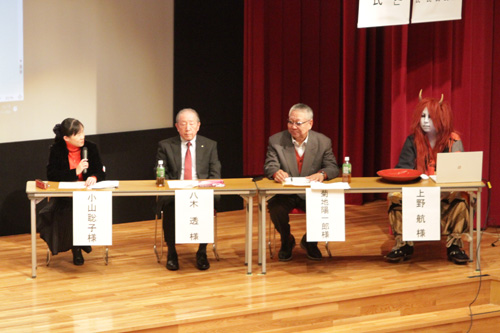 パネルディスカッションでは、大江山に伝わる鬼退治伝説の“酒呑童子”に扮して同町を盛り上げる上野航さん、世界鬼学会の八木透会長、鬼瓦の製作集団・日本鬼師の会の菊地陽一郎会長、基調講演をした二松学舎大学文学部の小山聡子教授が登壇。鬼や妖怪について話し合った。