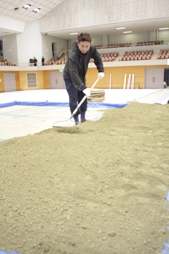 京都府福知山市猪崎の三段池公園総合体育館で16日、冬巡業大相撲福知山場所(実行委員会主催)が開かれる。会場では15日、力士たちが取組を行う土俵の設置作業が進んでいる。