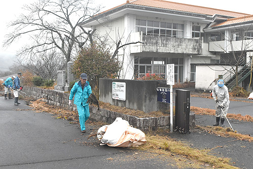利活用事業が頓挫した旧細見小学校 利活用見据え、地元有志が美化作業
