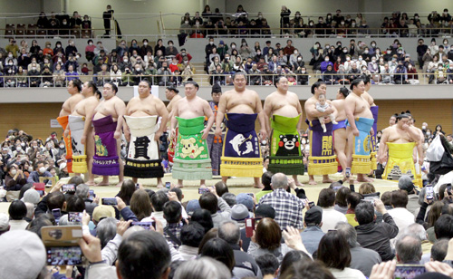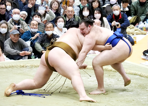 取組前には公開稽古や、地元出身の千代栄らに観客が質問する「力士ふれあい会」も実施。合間には髪結い、初っ切り、相撲甚句が披露され、力士がファンと会話を交わす場面も見られた。