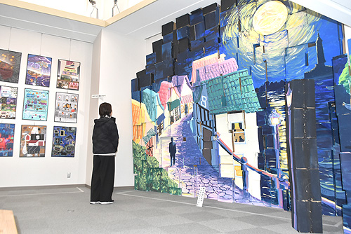 幅6メートル超の立体壁画も 多彩な127点が並ぶ 市美術館で高校アート展