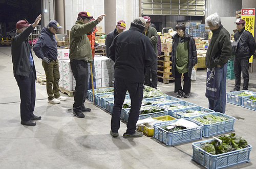 写真(クリックで拡大)=かごに入れられた野菜をじっくりと見る買受人(5日午前6時35分ごろ)