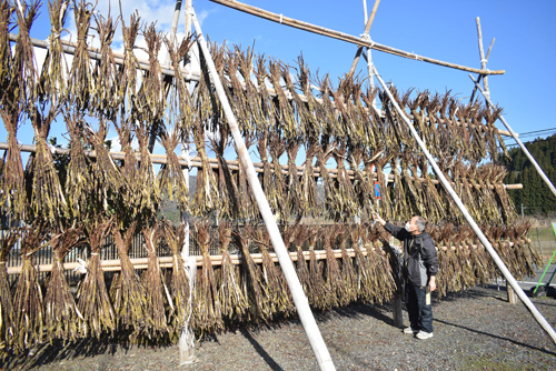 天日干しは、保存会のメンバーらが他の作業で協力したおかげで、前年と比べ約1カ月早い昨年12月中ごろから開始。天気の良い日の朝に掛け、夕方に外して倉庫にしまう。この作業を5、6回繰り返す。