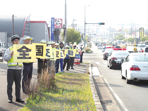 写真(クリックで拡大)=国道9号沿いで安全運転を呼びかける市民ら(昨年4月、春の全国交通安全運動で)