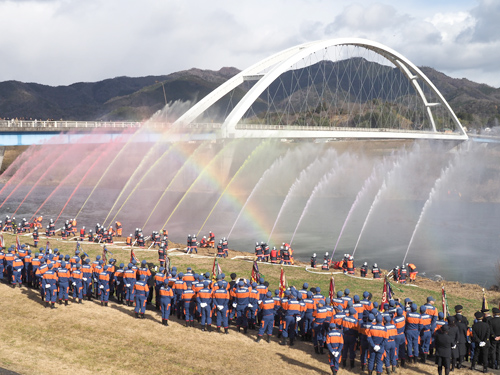 京都府福知山市の消防出初め式が11日にあり、市消防本部(澤田晴彦消防長)、市消防団(小谷晴昌団長)から合わせて750人が参加した。中ノの市厚生会館で式典を行い、広小路通りで分列行進、由良川河川敷で一斉放水を実施。市民の命と財産を守る「地域防災の要」として、災害に強いまちへの決意を新たにした。