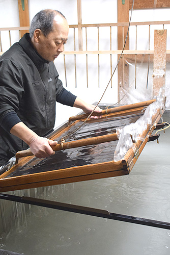 今季の寒漉きは5日から始めた。冷たい井戸水を張った漉きぶねの中にコウゾの繊維とトロロアオイの粘液を入れて、台にすだれを乗せた木製の道具「簾桁」で溶液をすくい取り、漉いていく。