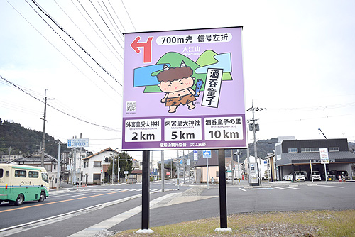 看板は薄いアルミニウム2枚で樹脂製の芯材を挟み込んだ「アルポリ板」で、板面の大きさは縦・横2・44メートル。両面に「700メートル先(手前) 信号左(右)折」と記し、同里への道案内を示す。かわいい姿の酒呑童子(鬼)や大江山、雲海のイラストをデザインしている。
