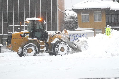 写真上(クリックで拡大)=市役所の平面駐車場で除雪作業(22日午前7時すぎ)