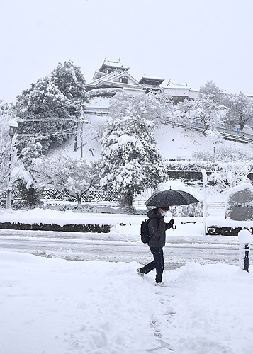 写真下(クリックで拡大)=雪に覆われた福知山城(22日午前8時15分ごろ)