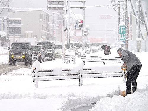 写真中(クリックで拡大)=岩井の国道9号沿いの歩道で雪かき(22日午前8時ごろ)