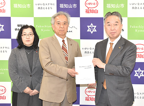 写真(クリックで拡大)=大橋市長(右)に報告書を提出した夜久委員長(中央)と菊田副委員長