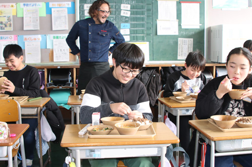 このあと、大槻さんは大橋一夫市長、廣田康男教育長らと1年と6年の教室を訪れ、児童が食べる様子を見学した。児童たちから「おいしい」との言葉を受け、「うれしい。作って良かった」と目を細めていた。
