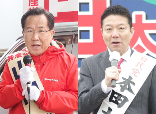 写真(クリックで拡大)=自民党前職の本田太郎氏(右)と共産党新人の山内健氏