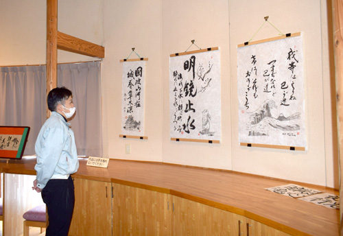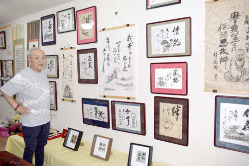 近年は書に墨絵を添えた作品にも挑戦。「毎回テーマを決めるのが大変で…」と語りながらも、来訪者の存在を励みに制作を続けていた。