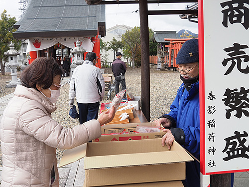 写真(クリックで拡大)=参拝者に福豆を贈った(春影稲荷神社で)