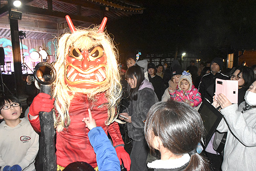 舞台を降りて歩き回ると、その気迫に半泣きになる幼児も。小学生らは勇敢に立ち向かい「鬼は外」の掛け声で一斉に豆で攻撃した。大人たちは鬼と子の攻防戦に目を細め、熱心にスマホで写真を撮影していた。