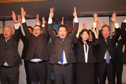 写真(クリックで拡大)=支持者とともにバンザイする本田氏(中央)