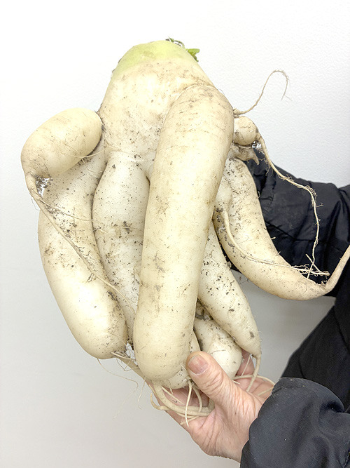 まるでイカみたい 奇妙な形の大根収穫 向野の楠元さん