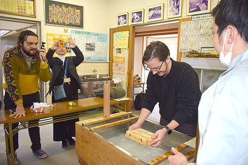 和紙伝承館でモニターツアー 海外の4人が魅力検証 紙漉きなど体験