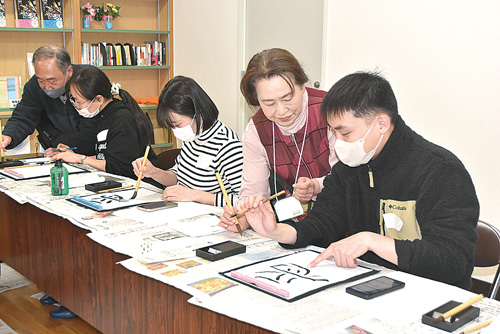 外国人に日本の伝統文化を知ってもらおうと、ふくちやま日本語教室(芦田義孝代表)は22日、京都府福知山市堀口の人権ふれあいセンター堀会館で、書道体験会を開いた。1月に企画していたが、大雪の影響で延期していた。ベトナムとウェールズ、インドネシアの計9人が参加し、真剣な表情で筆を持ち半紙に向かった。