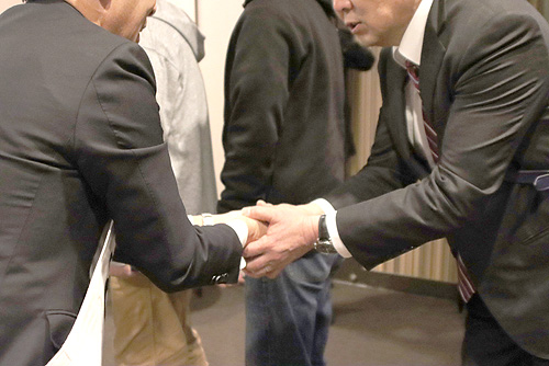 写真(クリックで拡大)=支援者と握手を交わす候補者
